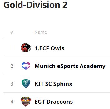 Unter den Gold Division Teams befinden sich auch die ersten Plätze der Sommerseason 2019: Munich eSports (ehemalige Munich Lions), 1.ECF Owls (ehemalige UEF Main Mercynaries) und Engines Stuttgart. In der ersten Gruppenphase konnten alle drei Teams den ersten Platz belegen. Zum jetzigen Zeitpunkt sieht es für den 1.ECF Owls gut aus, denn sie führen mit vier Punkten die Tabelle in der zweiten Gold Division an. In der 1. Gold Division hält Munich eSports die Führung mit zwei Punkten und so schaffen es beide Teams ins Viertelfinale. Dennoch werden wir jedes Team der Gold Division in den Playoffs wiedersehen, da die ersten Plätze ins Viertelfinale einziehen und die restlichen Plätze ins Achtelfinale.